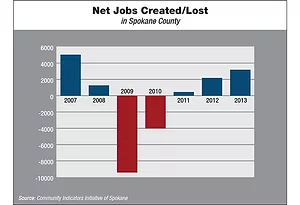Spokane County lost a total of about 13,500 jobs in 2009 and 2010, but as of last year had recovered only abo