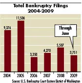Cases filed in U.S. Bankruptcy Court here jumped 44 percent during the first half of this year, compared with the same period last year, and observers say this year's total could hit 8,000 cases, pushing the level closer to the peaks seen in 2004 a