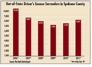 Out-of-state driver's licenses surrendered in Spokane County increased in 2011 for the second consecutive year following three years of steep declines, but economic analysts have varying views on what that means for the economy here.One analyst