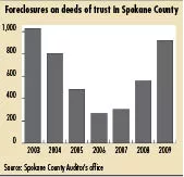 Foreclosures in Spokane and Kootenai counties continued to climb in 2009, and economic analysts here say any turnaround will be gradual.The Spokane County auditor reported 924 foreclosures on deeds of trust in 2009, up a steep 65 percent from in