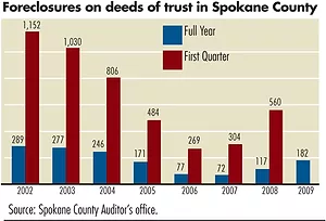 Despite a one-third increase in foreclosure actions in the first quarter compared with the year-earlier period, Spokane County's default rate was among the lowest in the U.S.'s metropolitan areas, says RealtyTrac, a national foreclosure data the of